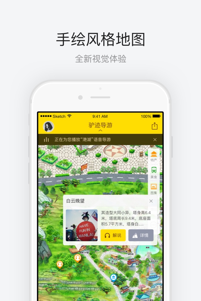 语音导游:专业主播录制的景点讲解及到点播报,多语种支持,走到哪儿听到哪儿。手绘地图:为景区量身定制手绘卡通地图,让您轻松看懂地图,永不迷路。