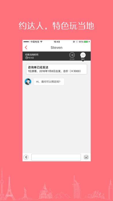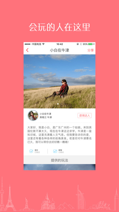【全球达人】提供众多海外本土达人,有深厚的本土文化经验与旅游经验,依据每个人的不同喜好,提供最适合你的玩法。【主题体验】提供最好玩的深度体验式出境游,体验最纯正的本地人生活