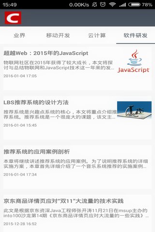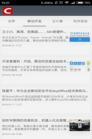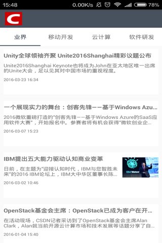 csnd大家想必都知道,在这里有前沿的csdn资讯,科技新闻,科研成果的展示,现在给分了四大模块的新闻,有业界新闻,移动开发有个的新闻,云计算有关的新闻,软件研发的新闻,如果你爱好科技,关注前沿科技,那就下载吧亲!