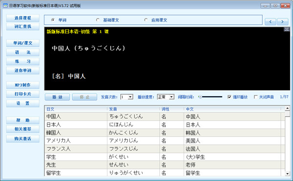 1.课程选择:选择你要学习的课程。2.词汇查找:双向同步翻译中日文。