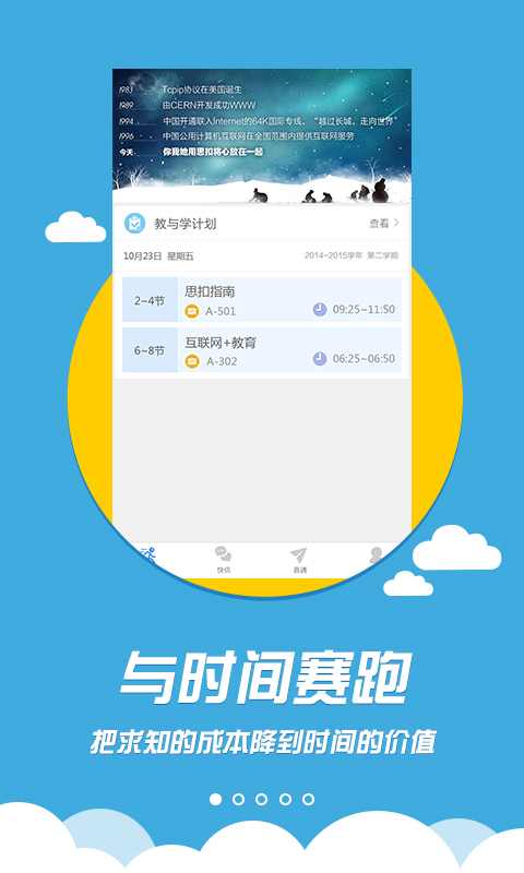 v2.02.0版本重新设计了【奔跑】模块,全面覆盖高校学生管理、教师授课、学生自学和活动类型,通过日程表制定个性的时间安排,直观展示个人日程计划。