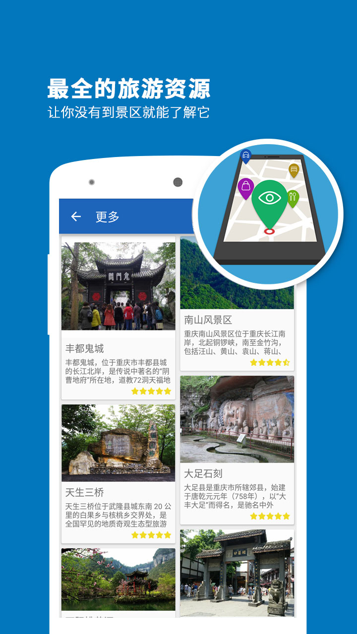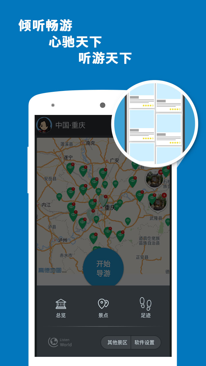 听游天下——重庆导游:专业的智能语音导游系统,专为喜欢自由行的旅行爱好者而设计。携手科大讯飞,带给您独特的重庆印象。重庆,座落于长江与嘉陵江交汇处,四面环山,两江环绕,城市傍水依山,层叠而上,既以江城著称,又以山城扬名。然而最具特色的,还要数山城的夜色。凭高眺远,万家灯火起伏错落,银霞明灭,与两江粼粼的波光、满天闪烁的星斗交相辉映,其景奇丽醉人。
