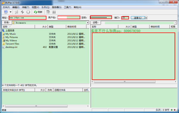运行该ftp上传软件,然后分别在“地址”、“用户名”、“密码”输入你知道的信息。端口号默认是21。根据别人提供给你的信息填写!