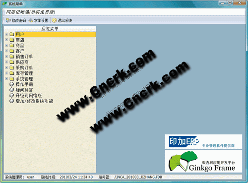 银杏树网店记帐通 V1.0 简体中文绿色免费版 一款适用于网上开店记帐,一般商店管理的软件。包含商品、客户管理,销售订单,采购、库存管理。可以自动生成销售、利润统计等多种报表、图表。可以同时管理多个店铺。此版本为免费绿色版,不需要安装,不需要注册,下载解压缩后即可使用,初始用户:user,密码:123。
