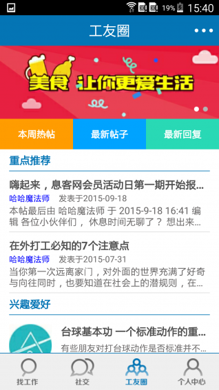 息客求职提供大量针对蓝领群体所在城市美食优惠、娱乐休闲信息、各大厂区论坛了解厂区最真实的信息反馈,在这里还能认识新的朋友,让你在陌生的城市不再孤单。
