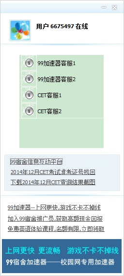 1、为您提供99宿舍网的免费注册、帐号使用、密码找回等通行证帐号的人工咨询;2、为您解答99加速器产品的咨询,包括99加速器的下载、安装及使用帮助;