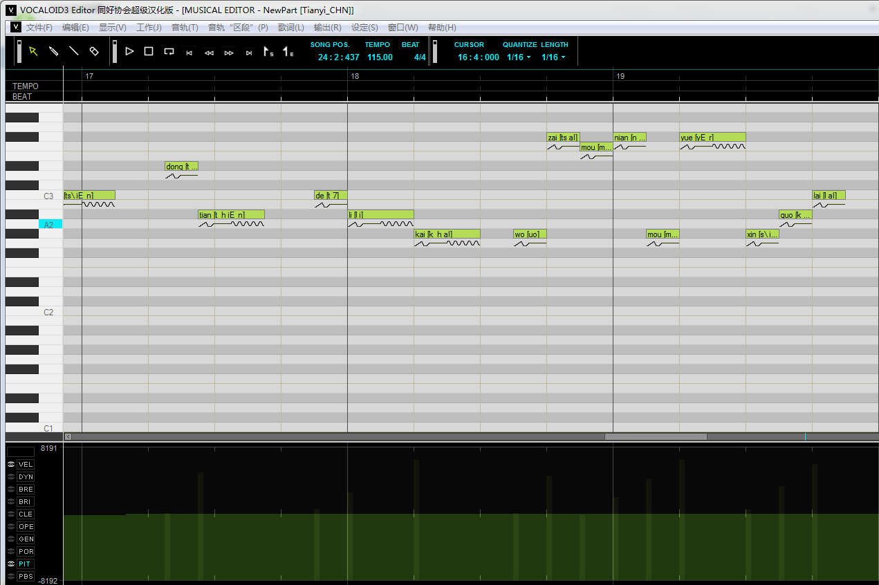 12、把MIDI文件导入后我们可以在画面上看到音符了,在音符上面双击鼠标就可以进行唱词编辑,用拼音的方式把歌词输入就可以进行简单的演唱了。