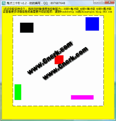 鬼才二十秒 V1.3 简体中文绿色免费版 最近发现网上有一款“试试你能坚持多久”的游戏,也就是控制红块躲闪飞行物体的碰撞以及避免与边框的摩擦,随着时间的推移,飞行物体的运行速度越来越快..........就这样,看看你能坚持多少秒,很是好玩有趣,我想着想着,也就写了一个,呵呵