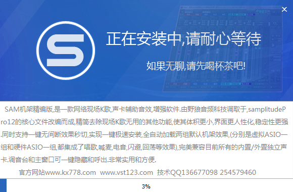SAM机架精编版,是一款网络现场K歌,声卡辅助音效,增强软件.由野狼音频科技调取于,samplitudePro12的核心文件改编而成,精简去除现场K歌无用的其他功能,使其体积更小,界面更人性化,稳定性更强.同时支持一键无间断效果秒切,实现一键极速安装,全自动加载两组默认机架效果,(分别是虚拟ASIO一组和硬件ASIO一组,都集成了唱歌,喊麦,电音,闪避,回荡等效果),完美兼容目前所有的内置/外置独立声卡.调音台和主窗口可一键隐藏和呼出.非常实用和方便.