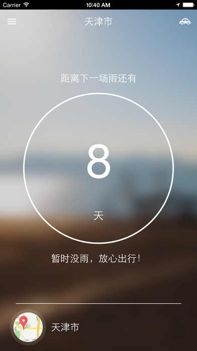 下一场雨是一款便捷的掌上天气预报监控软件。小巧便捷、容易上手是它的特点,贴心守时准确是它的功能,每天定时为你送上当天的天气信息,让你出门不惧风雨,万事俱备。