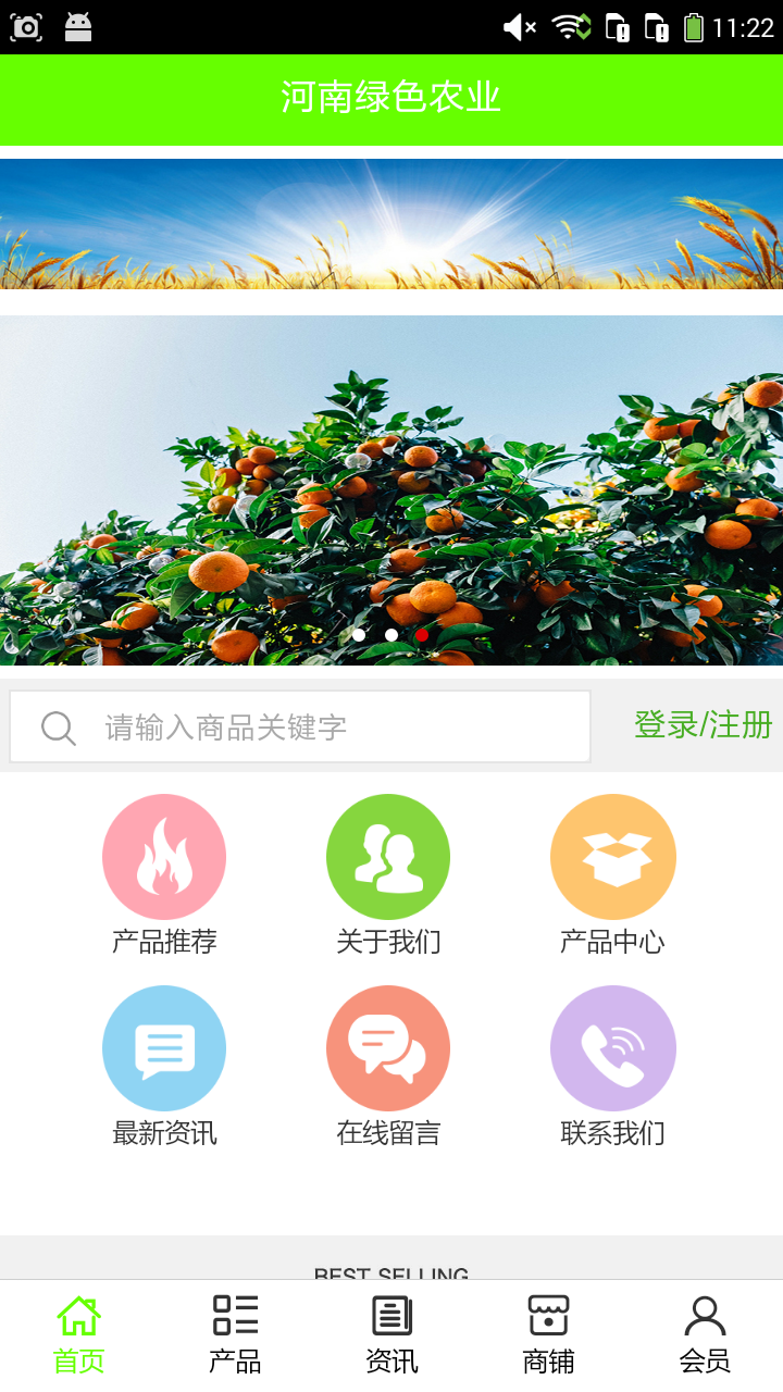 河南绿色农业app不仅具备购物、查询订单、搜索商品、行业资讯和产品评价等常用功能,而且还实现了手机版特有的会员注册登录、广告位、招商开店等功能。目标是整合当地品牌商、生产商、经销商,为商家和消费者之间提供一站式解决案。欢迎下载使用!