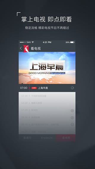 叩击时代,这里是看看新闻Knews。它是互联网世界中独树一帜的原创视频新闻品牌。新闻是它的核心,视频是它的特性,直播是它的亮点。打开看看新闻客户端,感受叩击时代的力量。看看新闻Knews由东方卫视新闻团队和上海电视台新闻团队联合出品,看看新闻客户端是上海广播电视台(SMG)官方新闻客户端。上海广播电视台(SMG)融媒体中心,由原东方卫视新闻团队、上海电视台新闻团队、外语中心团队和看看新闻网团队联合组建,力争打造互联网世界中独树一帜的原创视频新闻品牌。其原创新闻内容将在东方卫视、百视通互联网电视(OTT)、IPTV和看看新闻客户端等渠道,以及海内外多个社交网络平台上广泛呈现。“看看新闻Knews”是从“+互联网”到“互联网+”、从“你中有我,我中有你”到“你就是我,我就是你”的一次真正转型,将覆盖传统媒体和新媒体三种渠道:1、传统的东方卫视频道。