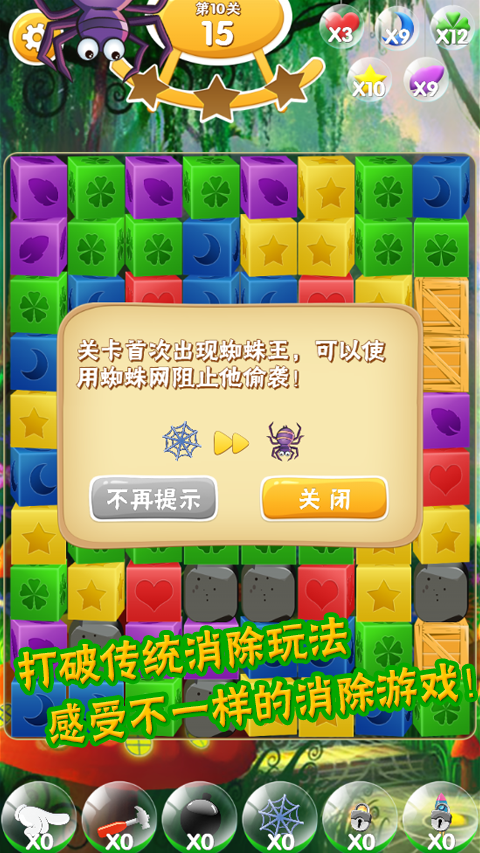 打破传统消除玩法,感受不一样的消除游戏!不同关卡会不同障碍物和道具。关卡中会出现蜘蛛王,当出现蜘蛛王时,要阻止他的偷袭才能更容易通关!