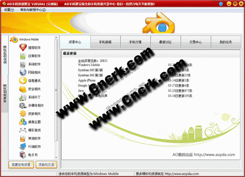 AO手机聚宝 V2010SP1 简体中文绿色免费版 AO手机聚宝是一款手机资源媒体互动平台。拥有强大资源库,包揽WindowsMobie、Symbian、Android、Java各大平台资源,以及电子书、来电铃声和图片多媒体,并且支持全部免费下载,资源支持用户评论互动。 除了强大的资源库之外,还拥有实时手机新闻,让你不需要到其他门户网站,即可第一时间掌握手机业界最新资讯。手机行情系统,将第一手的手机行情带到你的身边,让你在购机之中,掌握行情万变。