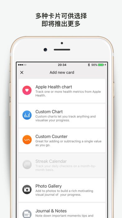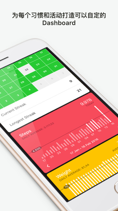 自定义图表:以自定义图表跟踪各种活动。想添加多少都可以,根据自己的需要自定义标题、单位和目标。只需点击两下就能添加新值。