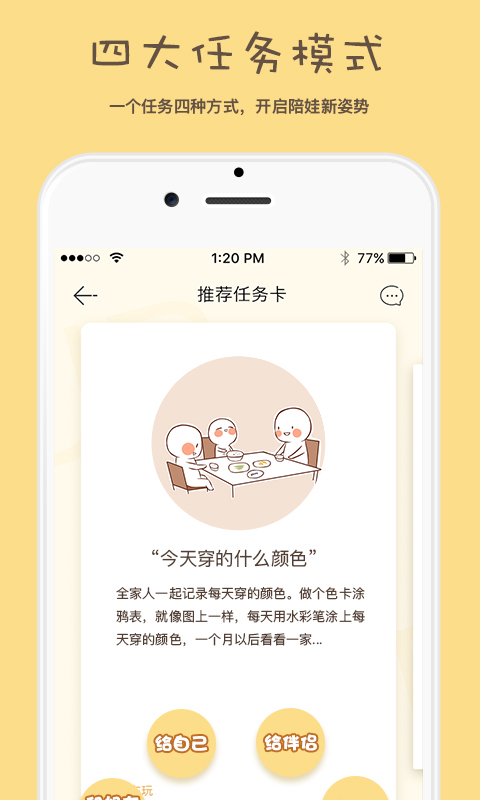 1.多种亲子任务卡。帮助宝宝习惯养成、培养宝宝的各项能力!一键领取,家长变身大儿童陪孩子一起成长!2.独特的任务模式。指派任务给爸爸,让爸爸也来分担带娃重任;还能和好友一起做任务,每个爸妈都能变身育儿达人!塞个红包更胜过千言万语!