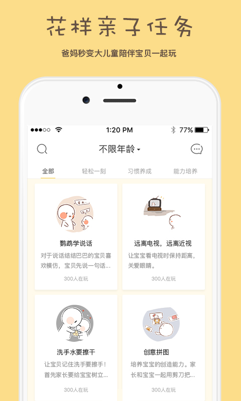 UpUpapp为父母提供适合2-7岁儿童的多种亲子互动方式,更有四大任务模式玩出新花样!是爸爸妈妈陪伴孩子的实用帮手!周末哪儿都不去,在家也能像去“迪士尼乐园”一样有趣,让父母和孩子共享亲子每一刻!【软件特点】