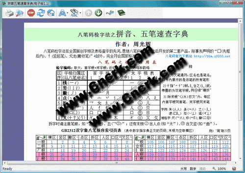 拼音五笔速查字典电子版 V1.1 简体中文绿色免费版 八笔码检字法在全国首创字根及表格查字的先河,是继八笔码输入法之后开发的第二套产品。本字典有三大特色:①用鼠标往页表中一点,即可直接查字;②只要笔顺标准,没有查不到的字;③学会了查字,也就学会了八笔码打字(检字码+拼音头)。