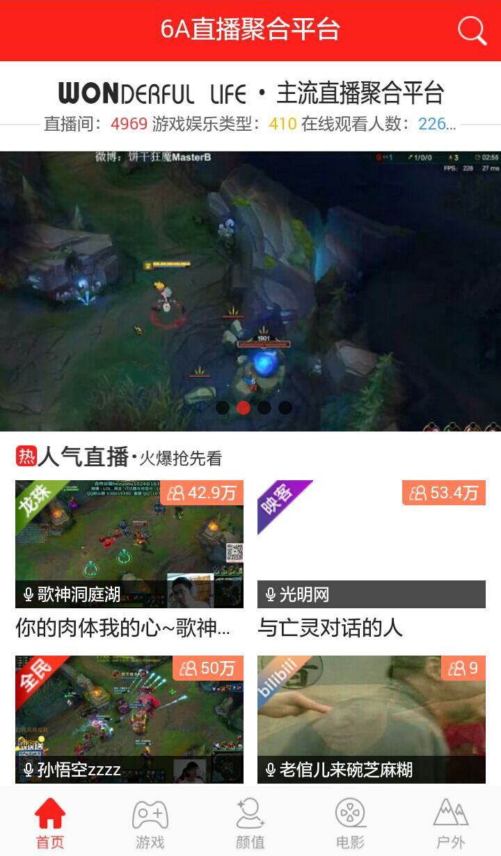 与她的另一种相遇方式,6A直播 最6游戏:聚合当前热门游戏,燃尽双手释放激情,冰与火的交战。 最6主播:cosplay二次元,气场御姐,抖M女王,傲娇软妹,曼妙美腿、气质女神及不可描述的特色主播。 最6合集:斗鱼、龙珠、虎牙、战旗、全名、熊猫、映客、花椒、B站。 最6感观:底部5大模块,空间布局合理,几何色块鲜明,简明易上手。 最6操作:帮助引导,常规输入搜索,配合筛选,视频切换流畅过渡。 最6乐趣:探险美食,漫展撩妹,经典电影,动漫相声,主播连线。