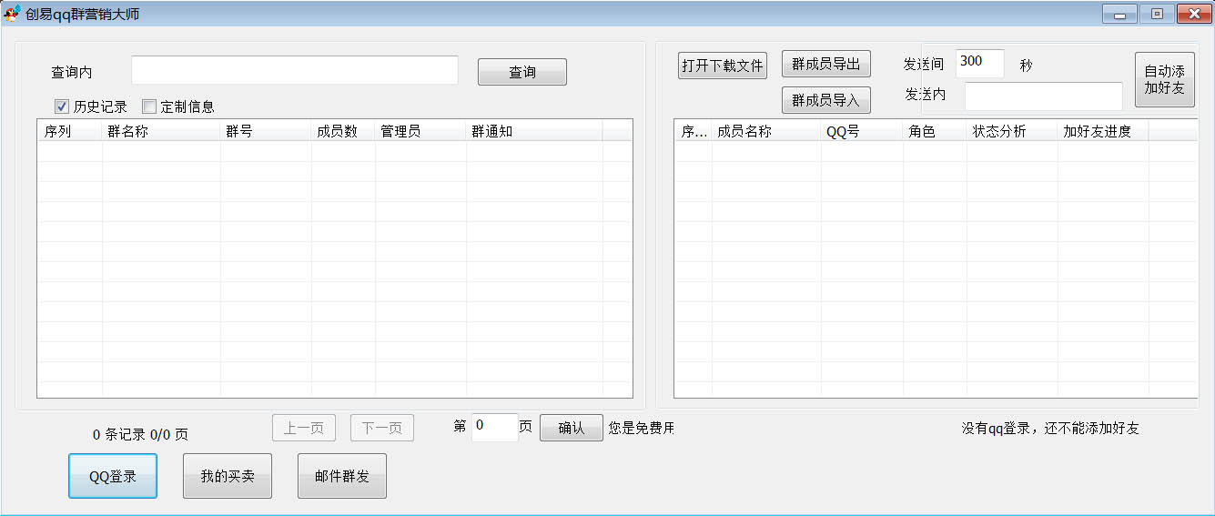 创易qq群营销大师是一款免费的QQ全自动营销软件,该软件拥有自动加好友、QQ群群发、QQ好友群发等功能,让您可以快速登录QQ ,一键进行群发。