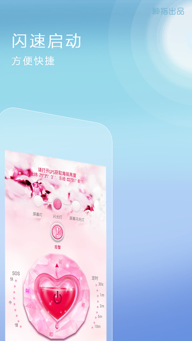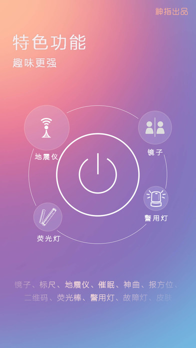 绝无广告、完全免费的手电筒,稳定性最好的手电筒,最亮的手电筒。特色功能:地震警报、安全防狼、报方位、海拔高度经纬度、炫彩灯、指南针、标尺、安神催眠、镜子。启动速度快,设计精美,是第一款根据IOS7风格设计的手电筒应用。【软件特点】