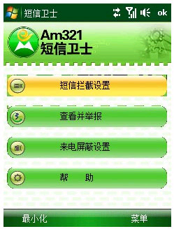 Am321短信卫士 for PPC 简体中文官方安装版 昨天,记者从中国电信了解到,作为治理垃圾短信的重要措施,中国电信将向其手机用户提供免费终端治理软件“Am321短信卫士”.“Am321 短信卫士”是中国电信、12321举报中心和光芒星空联合开发的垃圾信息过滤处理及举报软件,经过工业和信息化部软件测评中心测评,该软件对垃圾短信的识别率达到了96.32%