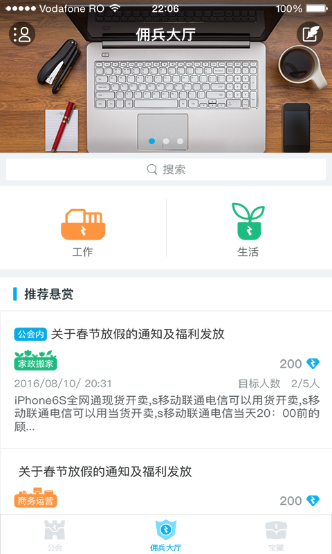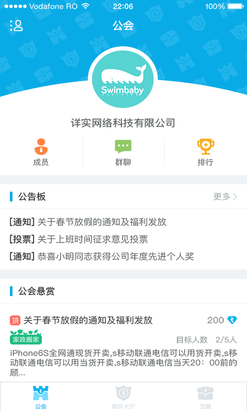 2、公会内除了会发布各种悬赏,还有各种行政及人事通知,过节除了月饼粽子,还有职钻和公会经验可拿哟。