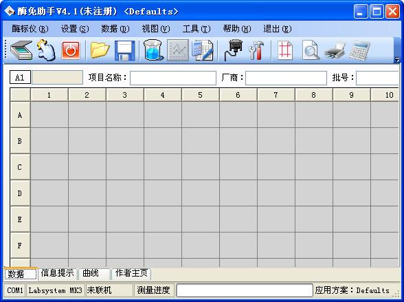 酶免助手 v4.1.0.1 简体中文绿色免费版 酶免助手是一款为方便酶免试验及分析数据而编写的专用软件 ,编写本软件的初衷是通过酶标仪与计算机的联机,将不同厂家的酶标仪集成于一个统一的操作界面,增强酶标仪的易用性,提高工作效率。本软件支持多种酶标仪的同时还内置了常用的数据分析方法,如计算S/CO,线性拟合及曲线拟合等,方便您对酶免数据进行定性或定量分析。当前版本为2.3(正式版),欢迎您对本软件提出意见和建议,以利于本软件的进一步改进!