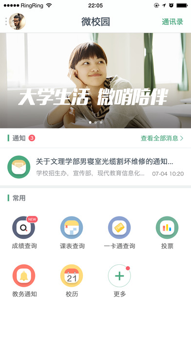 通过登录微哨,在网络认证的同时,实现了信息的统一快速感知。无论是通知或者应用系统(如:选课、OA、一卡通)的应用消息;还是双人会话、群、讨论组的多人会话消息,统一呈现。