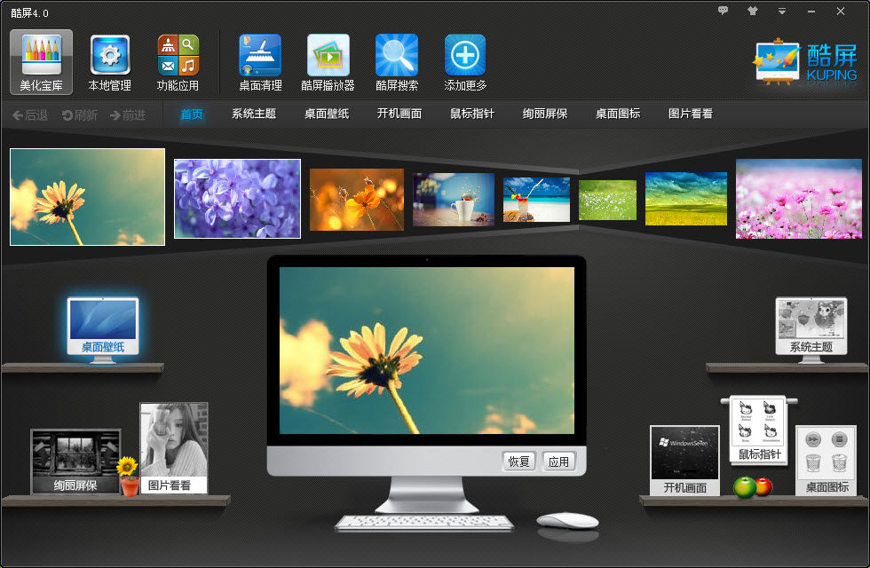 酷屏提供快捷便利的分类搜索、系统搜索、颜色搜索、关键字搜索等查找功能,实现壁纸、主题、桌面图标、鼠标指针、绚丽屏保、开机画面的快速预览、应用;从此,我们美化电脑变得更加简单、容易,酷屏一下,就有你想要的炫酷屏幕……
