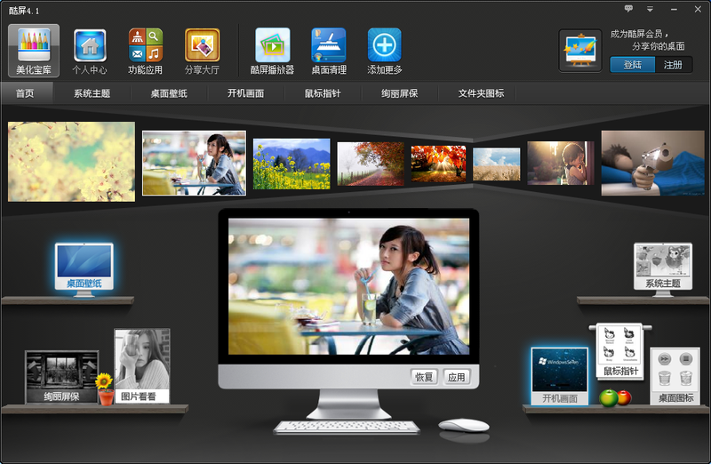 起点提供酷屏2016官方下载,酷屏是一款免费桌面美化资源管理应用软件,酷屏不仅集成近海量的XP电脑主题、win7主题、桌面壁纸、电脑登陆界面、鼠标指针、桌面屏保、文件夹图标等桌面美化资源,您可以每天可以随你的心更换主题和壁纸,让你的电脑桌面每天焕然一新。