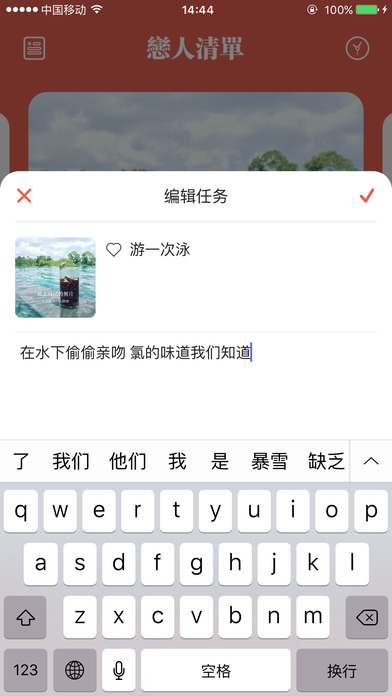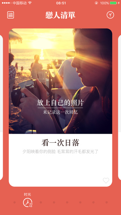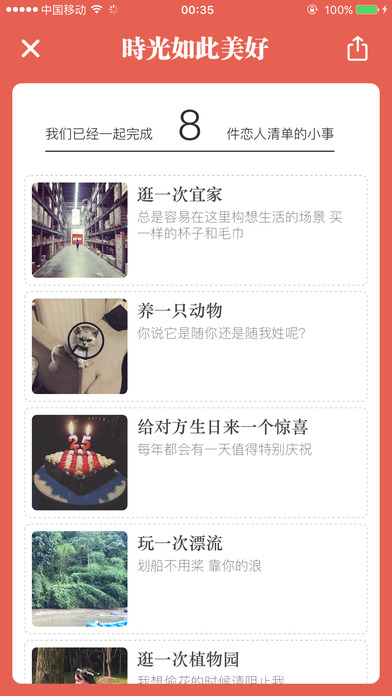 恋人清单的整个应用都非常的美,连图片也能看出这是一对情侣用的。清单用大图加文字,美轮美奂的感觉,恋爱中的人每一件事情都是享受。清单列表左右滑动切换,优雅美观。一个专为情侣设计的Todo List,灵感来源与于电影《遗愿清单》,分『生活』『时光』『兴趣』等八个主题,一百件小事,用照片记录回忆,一张张卡片一段段美好记忆,写下在一起的日子,特殊日子特殊提醒。
