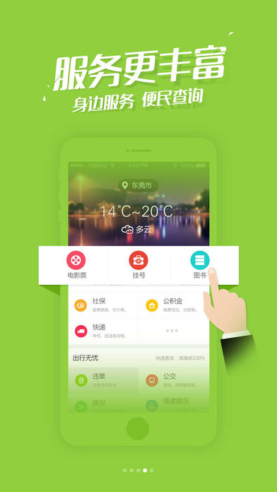 4、服务模块新设计新界面,服务功能更丰富,更关注东莞本土服务信息,便于用户查询;