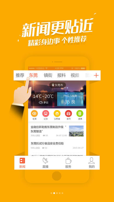 5、东莞阳光台2.0版本强调专注东莞,服务本土,强力打造以新闻、直播、服务为核心的东莞本土新媒体客户端。