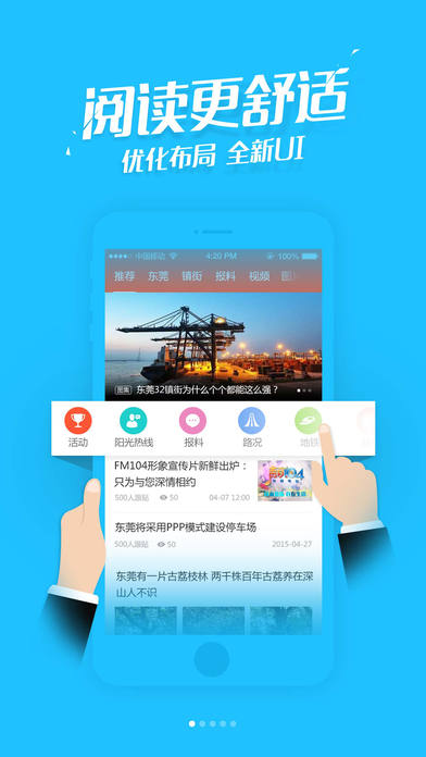 东莞阳光台客户端是东莞广播电视台官方新闻客户端、全媒体移动门户和旗舰,致力于创新资讯传播与互动形式、提升本地民生服务能力。新版阳光台客户端汇集了:本土最权威全面新闻及生活服务资讯,视音频直播点播,互动图文直播,新闻专题,市民问政,新闻爆料,天气、空气指数、影讯影票、路况、违章、公交、快递、、社保、公积金查询,医院挂号,图书检索,证券开户,代驾叫车等特色服务功能。在这里,您还可以与主持人倾心交谈、与广播电视节目实时互动;遇到烦恼交给“阳光问政”;有了线索,时事爆料获取奖品。感受大城小事,共享莞城阳光,精彩尽在掌握!