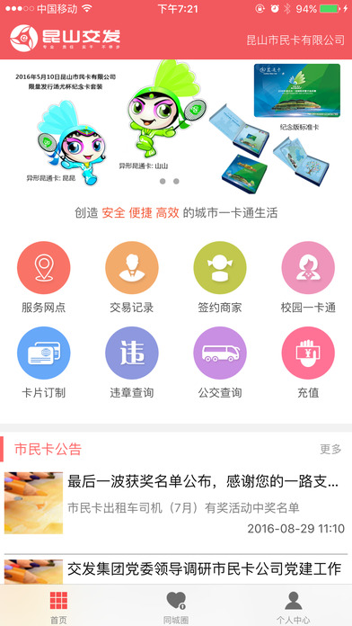 基于现有市民卡载体和用户,建设服务于昆山本地市民的手机应用,功能主要包括学生卡、违章查询、服务网点、签约商家、商家交易、同城圈查询等功能。