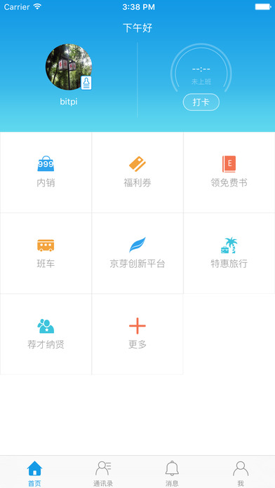 【应用首页】:满足企业员工日常办公、生活需要,提供内销、福利券、领免费书、班车、京芽创新平台、荐才纳贤、特惠旅行功能插件,你的办公助手,你说了算。【消息】:打卡、内销等消息推送提醒,不让你错过任何一条重要信息!