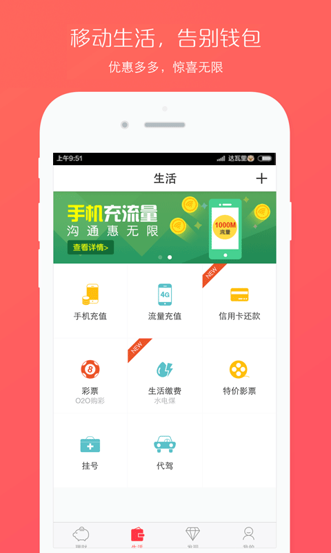 生活钱包:内嵌钱包,生活缴费,出行,娱乐,挂号等一手掌握,方便快捷