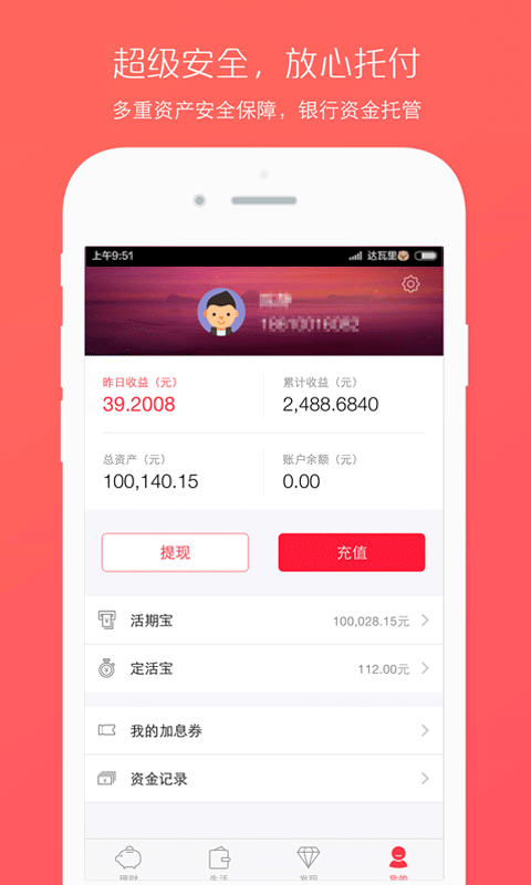 安全可靠:本息保障,精选优质债权,银行级别风控体系高额收益:无论投资活期宝还是定活宝,收益都是杠杠滴