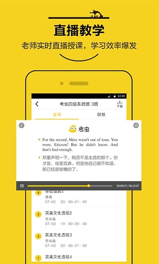在线直播:在考虫购买的课程,都汇集在这里,你可以在线全屏听直播课程。