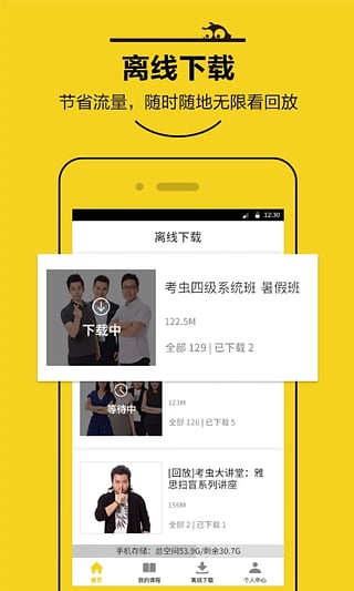 离线下载:您可以将课程下载到手机中,无论是自习室还是图书馆,随时随地学习,再也不用担心流量和网络了。