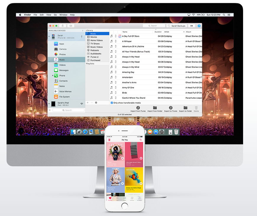 传输至任何 iOS 设备:即时添加任何 PC 或 Mac 的音轨和专辑。不同于 iTunes,iMazing 允许您将多部设备安全地连接至电脑。从 iTunes 资料库拖放音频文件或导入歌曲至 iPhone、iPad 或 iPod Touch。再也不用执行危险的同步操作,和沮丧说再见。