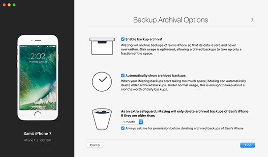 不同于 iTunes 或 iCloud,iMazing 永远不会覆盖您的 iPhone 和 iPad 备份。且无需使用付费的云存储空间。它可靠且创新,是市场上唯一免费提供自动备份和存档解决方案的软件。