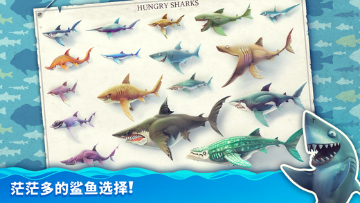 可以收集各有 7 种不同大小的 20 类鲨鱼品种,扮演敏捷的双髻鲨,甚至到著名的大白鲨!在食物链中不断向上提升,将你超棒的伙伴升级:咬得更痛、游得更快,且长得…更饥饿!