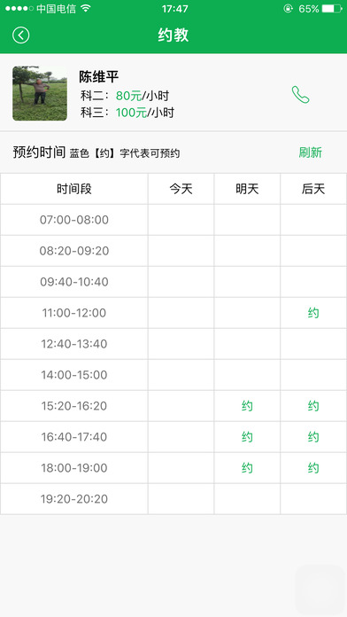 5.选择时间口点击“约”,再次确认是否是用户需要练习的科目,确认后进入约教信息确认界面,填写接送地点与留言,点击确认预约待缴费成功后预约成功。