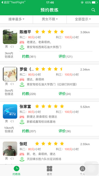 4.进入教练信息界面,此界面中有教练各项信息;选择训练的科目,进入约教界面;