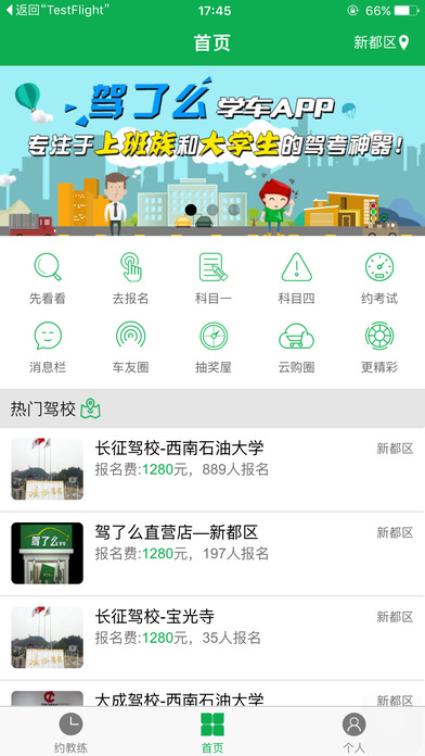 “驾了么”驾考服务平台通过对传统一费制驾培模式的颠覆,分开收取报名费与培训费,最大程度地降低学车的经济成本。同时“驾了么”驾考服务平台将整合成都地区各大驾校的优质学车资源,学员可以通过平台获取最舒心的驾考服务体验,随心选择金牌教练,自主安排学车日程,享受一对一VIP式驾考培训,实现了学员自主约教、自主约考,根据自身时间预约教练、预约考试。【软件优势】