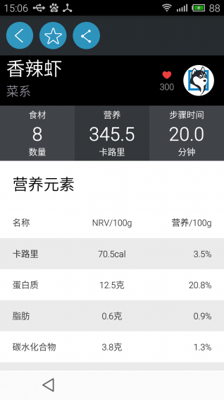 3、营养元素:你可以直观的看到这一道食物具体包含多少卡路里,脂肪、蛋白质、钙、铁等等都含有多少