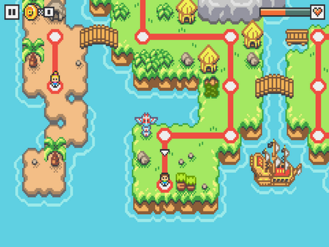 游戏就从本杰明一行人到达岛上之后开始。游戏采用了像素风格的画面设计,看来许多的休闲游戏到现在还是非常热衷于此类画风的,加上游戏采用了横版闯关解谜类的玩法,体验起来还颇有一番复古的感觉。而游戏的音乐也同样的采用了复古的电子乐的设计,声音与画面配合还是非常得当的。与传统的同类型游戏相比,游戏还是有许多创新的地方的,例如在进入游戏之后,玩家可以控制包括本杰明在内的全部四名角色,不过四名角色都分布在岛上不同的地方,而且不同的角色前进的路和关卡都是不一样的,玩家直接点击就可以选择任意一个关卡开始挑战,玩家并不需要先闯过当前关卡才能解锁下一个关卡,这样的设计让玩家可以随心所欲的挑战自己想挑战的关卡。