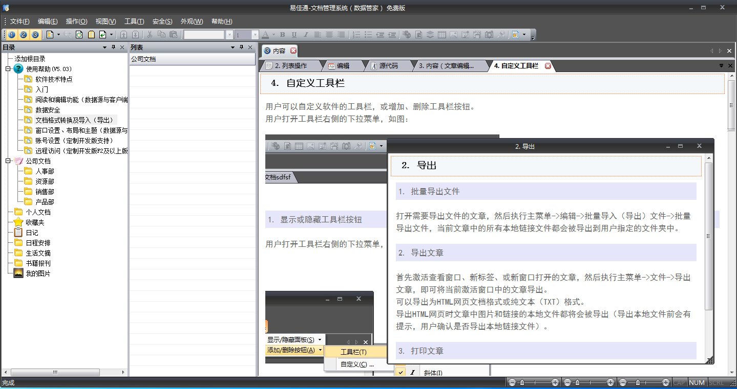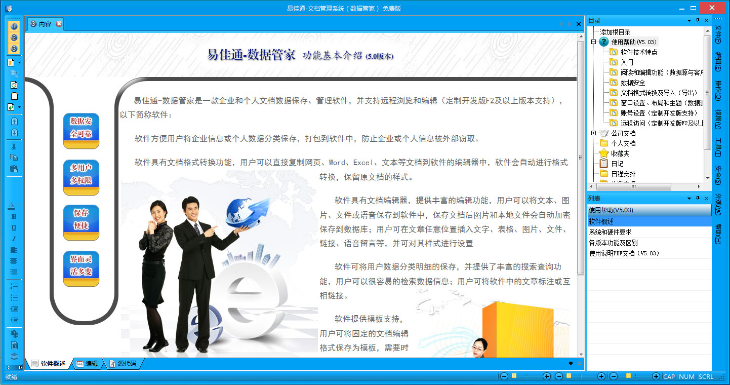 易佳通文档管理系统是一款免费的文档管理软件。它不仅可提供强大的文档编辑功能,还可使用智能的管理系统为用户便捷的管理文档,还具有加密功能哦 。